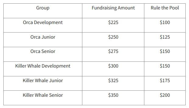 Each swimmer is asked to participate in our Rule-the-Pool Event. This a fun team-building event that takes place each year. This is the one and only mandatory club fundraiser with 100% of the proceeds going to the club. Each swimmer has a mandatory minimum of pledges they must collect as outlined in the chart above.